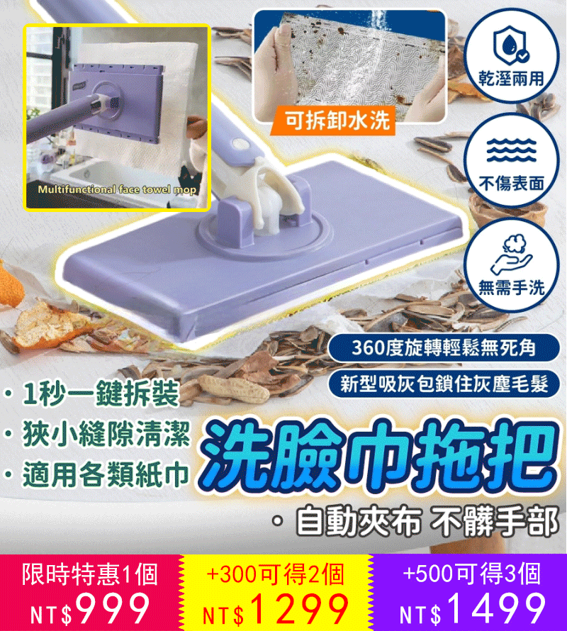 4分鐘前【2024設計獎得獎上新】免手洗懒人伸縮拖把,新升級設計,不在擔心拖把不好弄,新升級長度設計,同時不沾手放人工擰拖把,使打掃變得簡單 - 【今日限定 買一送一 2把+ 拖布*2包 】-NT$999